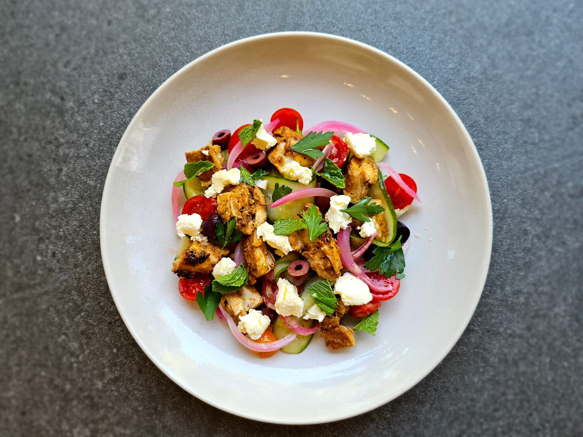 Marinated Elgin Valley Chicken thighs are barbequed and put together with a salad of cucumber, red onion, tomato, olives, parsley, mint, oregano & lemon. Wombye Persian fetta is to finish