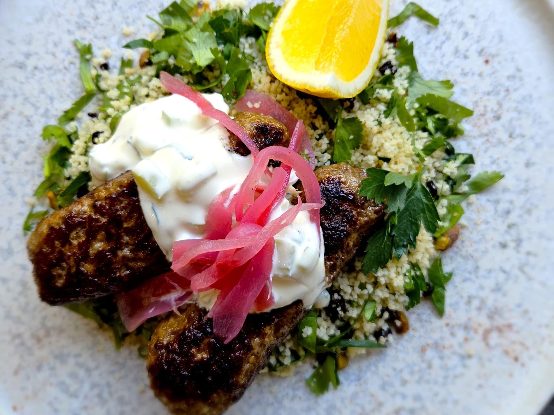 Spiced Grass fed beef mince from Eastwell Farms is rolled & grilled. Served with yoghurt, pickled red onion and a herbed cous cous salad with almonds, coriander, parsley, mint & currents.
