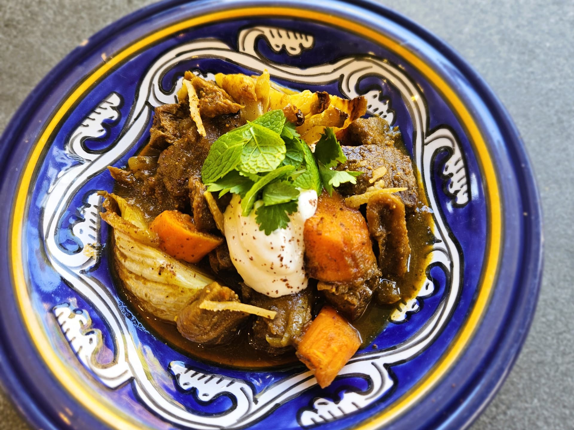 Slow cooked Grass Fed Beef are cooked in a fragrant blend of middle Eastern spices, along with Harissa charred carrots, fennel, Tomatoes & dried figs. Served with roasted Macadamia & Preserved lemon Labneh.