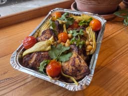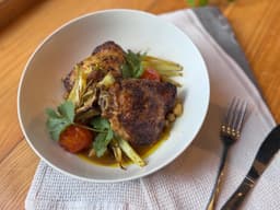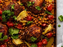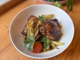 Chicken thighs, Salt, Chickpeas, Cherry tomatoes, Fennel bulb, Moroccan Marinade [Lemon whole, Olive oil, Baharat Spice Mix, Sea salt, Garlic, Cumin Powder, Smoked Paprika, Ground Black Pepper], Extra virgin olive oil, Olive oil, Sea salt, Turmeric, Ground ginger, Fresh coriander, Pepper white ground