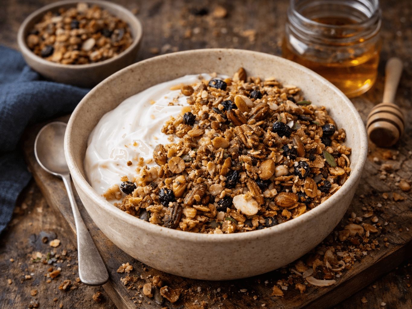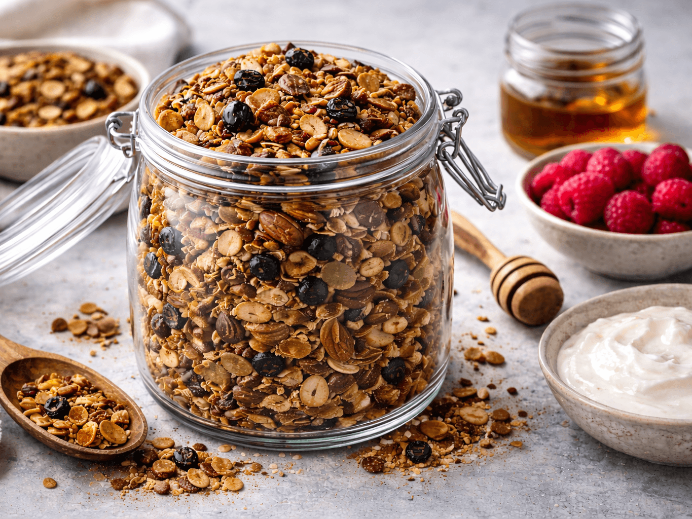 This Paleo Granola recipe is a nutrient-dense, grain-free option that’s perfect for those looking for a wholesome, low-sugar breakfast or snack. It’s made with a blend of mixed nuts (almonds, macadamias, hazelnuts, and Brazil nuts) and pepitas, along with unsweetened desiccated coconut and coconut flakes for added crunch. The dried fruit—sour cherries, blueberries and cranberries—adds natural sweetness, while chia seeds provide a dose of fibre and healthy fats. The zest of an orange brings a bright, citrusy note that elevates the flavours. This granola is perfect for topping your morning smoothie bowl, eating on its own as a snack, or pairing with dairy-free yogurt. It’s paleo-friendly, gluten-free, and free from refined sugars, making it a great choice for a quick, energy-boosting meal or snack!