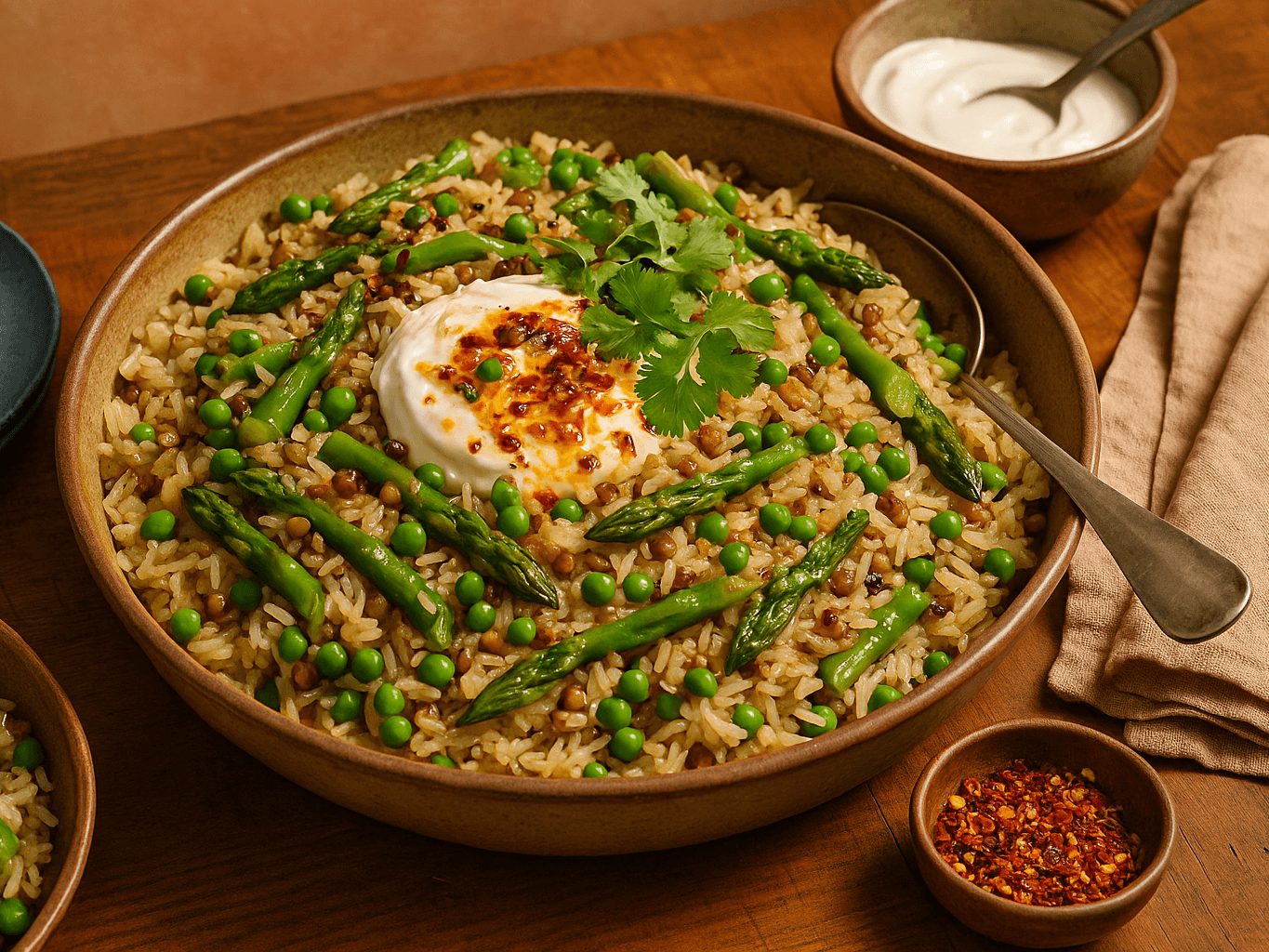 A light, feel-good dish that celebrates the best of the season. Fragrant basmati rice and earthy brown lentils are gently spiced with cumin, mustard seed and a hint of chilli, then tossed with tender asparagus and sweet baby peas. Finished with a dollop of creamy yoghurt and fresh coriander, it’s fresh, wholesome and full of texture. Perfect on its own for an easy weeknight dinner, or served alongside grilled chicken or fish. Comforting yet vibrant and the kind of side that tastes like spring on a plate.