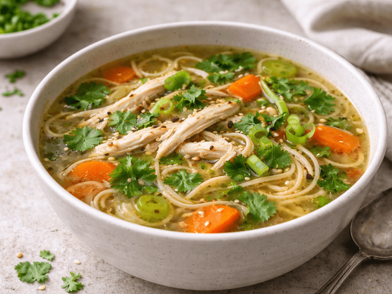 There’s nothing quite like a good chicken noodle soup and this one’s got soul. We start with a rich, house-made chicken stock and whole free-range chicken, simmered low and slow until perfectly tender. Then we stir through silky egg noodles, fresh carrot, celery and onion for that classic homely comfort. A drizzle of sesame oil, a hint of ginger and a splash of light soy bring gentle warmth and depth, while fresh coriander and spring onion lift it all with bright, aromatic freshness.