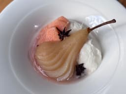 Pears, Fruit poaching syrup [Water, Castor Sugar, Orange Whole, Cloves whole, Vanilla bean, Cinnamon Stick, Cardamom pods, Star anise whole]