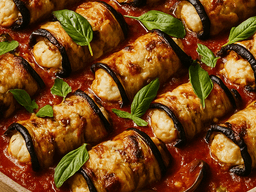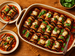 Eggplant, House-made tomato sugo, Involtini Filling [Ricotta Cheese (Milk), Parmesan Cheese Grated (Milk), Whole egg, Breadcrumbs white (Wheat), Parsley, Basil, Sea salt, Garlic, Pepper white ground], Mozzarella cheese (Milk), Bocconcini (Milk), Basil