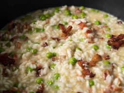 Chicken stock NG, Arborio Rice, Peas Baby Frozen, White wine, Onion, Pancetta, Olive oil, Parmesan Cheese Grated (Milk), Unsalted butter (Milk), Garlic