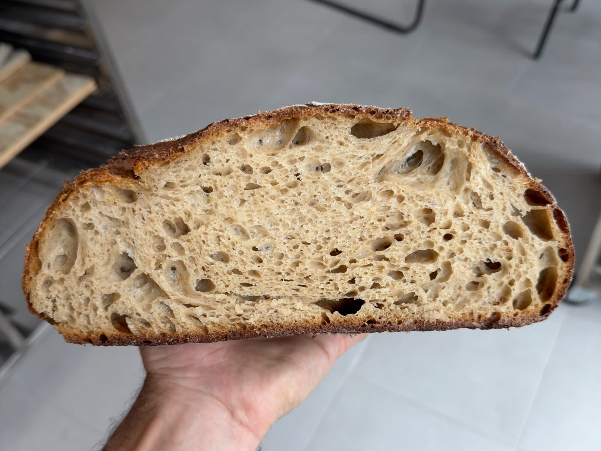 This month we are changing our table loaf from our classic pain de campagne to a long fermentation miche, made with Yecora red wheat, by only mixing the dough slightly and doubling our fermentation time, we make for a deeper flavour and an easier to digest loaf of bread. Showcasing the work of local farmers from Burrum biodynamic and our miller friend, James fisher.