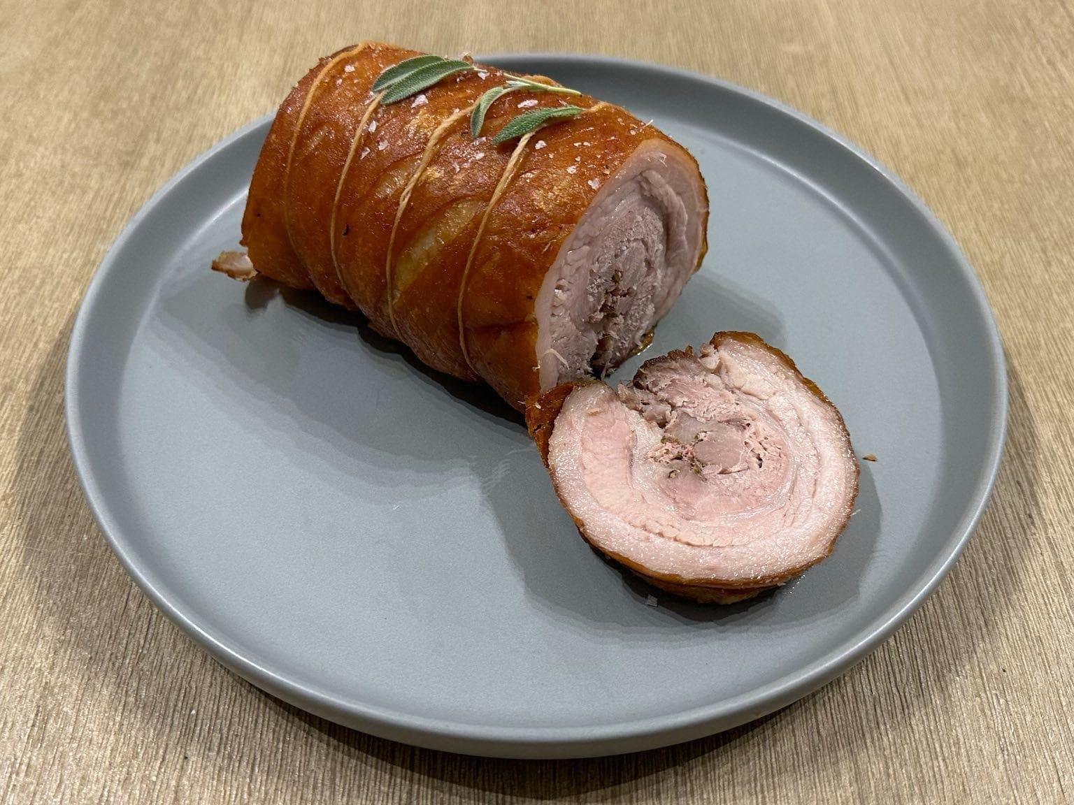 Juicy pork loin slow cooked in the sous vide, then dried, ready to make the crispy pork crackling on top! Served with roast veggies, peas and gravy to make this one is a wonderful rich and filling dinner.