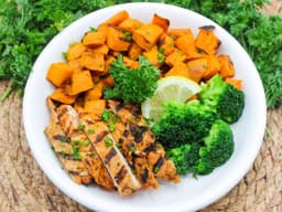 Oven-roasted chicken breast with roast sweet potato and steamed broccoli, finished with a light lemon-garlic olive-oil dressing. A bright, fresh meal that’s full of flavour and freezer-friendly.