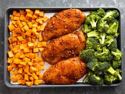 Chicken breast, Sweet potato, Olive oil, Broccoli, Meyer lemon, Garlic, Oregano, Salt, Black pepper