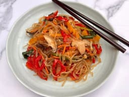 Korean glass noodles, Red capsicum, Yellow capsicum, Brown onion, Shitake mushrooms, Carrots, Vegetarian mushroom sauce (Wheat, Soy), Spring onion, Mushroom soy sauce (Wheat), Sugar, Garlic, Rice bran oil, Sesame oil, Seasoning soy sauce (Wheat), Sesame seed, Cracked black pepper, Ground pepper