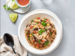 Jasmine rice, Plant-based chicken strips, Soy sauce (Wheat), Rice bran oil, Shitake mushrooms, Sesame oil, Sugar, Green pea, Corn, Carrots