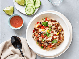 Jasmine rice, Plant-based bacon, Vegetable oil, Cocoa butter, Pea protein, Yeast extract (Wheat), Thickener, Natural flavour, Beetroot powder, Caramel 150a, Shitake mushrooms, Soy sauce (Wheat), Rice bran oil, Green pea, Corn, Carrots, Sugar, Sesame oil