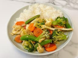 This vegetable stir fry with rice dish is the perfect combination of flavour and nutrition. A medley of crisp snap peas, antioxidant-rich Shimeji mushrooms and other seasonal veggies (cauliflower, broccoli, carrot and Chinese cabbage) that are perfectly stir-fried to bring out their best flavours. Served over fluffy jasmine rice, making this a complete meal that will leave you feeling satisfied and nourished. Whether you're looking for a quick lunch or an easy dinner solution, this dish is sure to hit the spot, with its healthy ingredients, satisfying texture, and bold flavours. So why wait? Treat yourself to this delicious and nutritious meal today. 这道蔬菜炒饭是风味与营养的完美结合。 脆豌豆、富含抗氧化剂的姬菇和其他时令蔬菜(花椰菜、西兰花、胡萝卜和大白菜)的混合物,经过完美炒制,以呈现出最佳风味。 配上松软的茉莉花(或糙米)米饭,使这顿饭成为一顿完整的饭菜,让您感到满足和营养。 无论您想要一顿快捷的午餐还是简单的晚餐,这道菜一定能满足您的需求,因为它的原料健康,口感令人满意,口味大胆。那为什么还要等呢?今天就犒赏自己一顿美味又营养的饭菜吧。