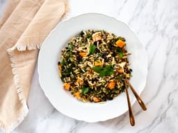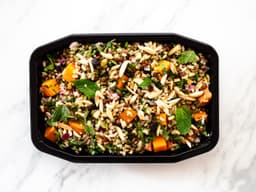 A satisfying melody of ancient grains - quinoa, brown rice, lentils - mixed with herbs, seeds and dried fruit, topped with a coconut cumin yoghurt dressing.