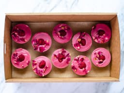 Strawberry Cheesecake Filling [Frozen Strawberries, Nuts, Cashew, Coconut Cream, Maple Syrup, Oil, Coconut, Lemon Juice], Strawberry Cheesecake Base [Almond Meal, Dates, Coconut, Desiccated (Sulphites), Salt], Strawberry cheesecake decoration [Frozen Strawberries, Dried Rose Petals]