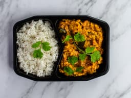 Comes frozen. Microwave from frozen. A creamy and satisfying eggplant and red lentil dahl with a delicious medley of spices, served with fluffy jasmine rice.
