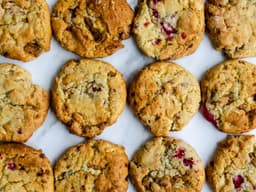 Chewy golden cookies studded with white chocolate and raspberry.