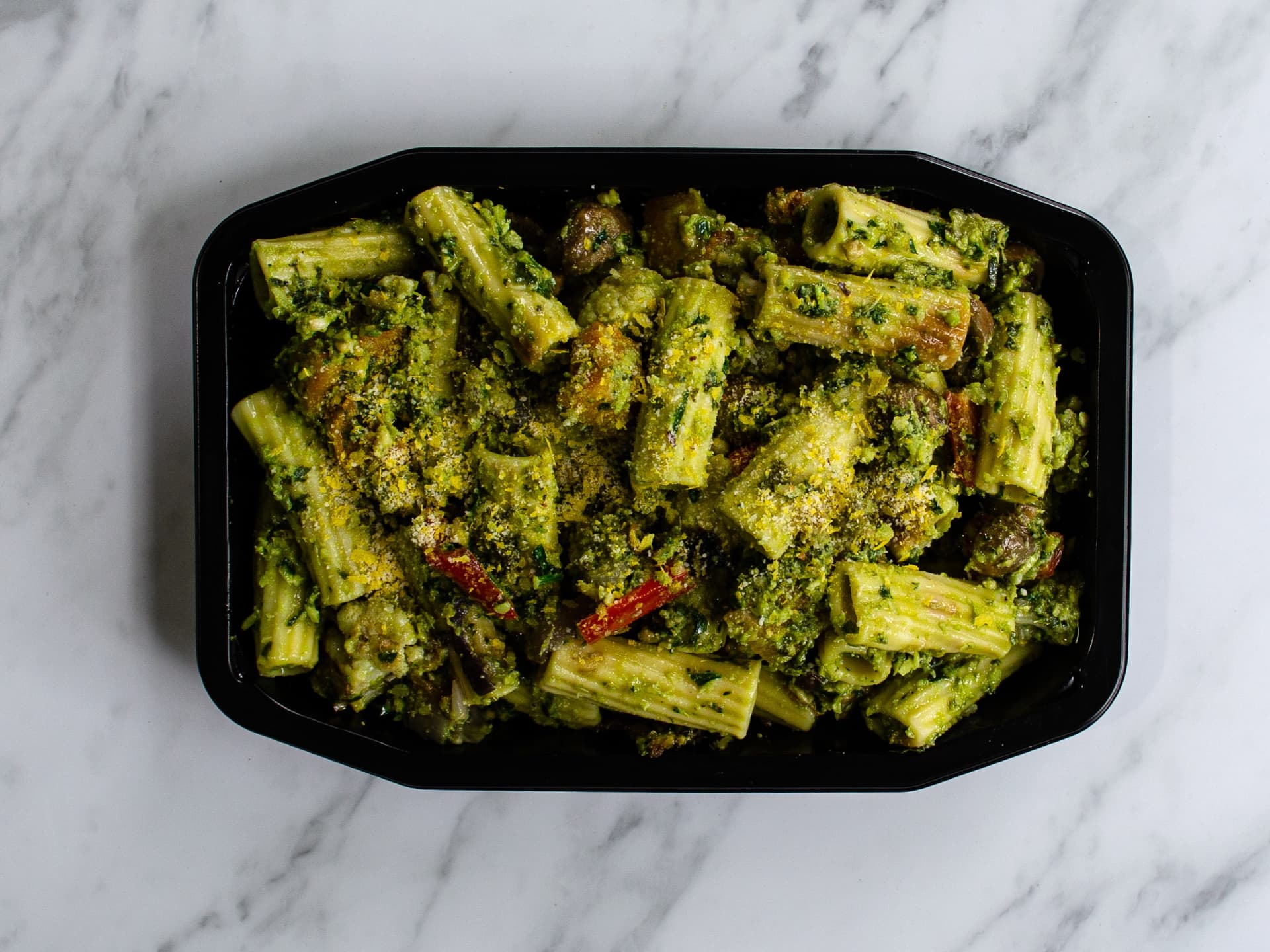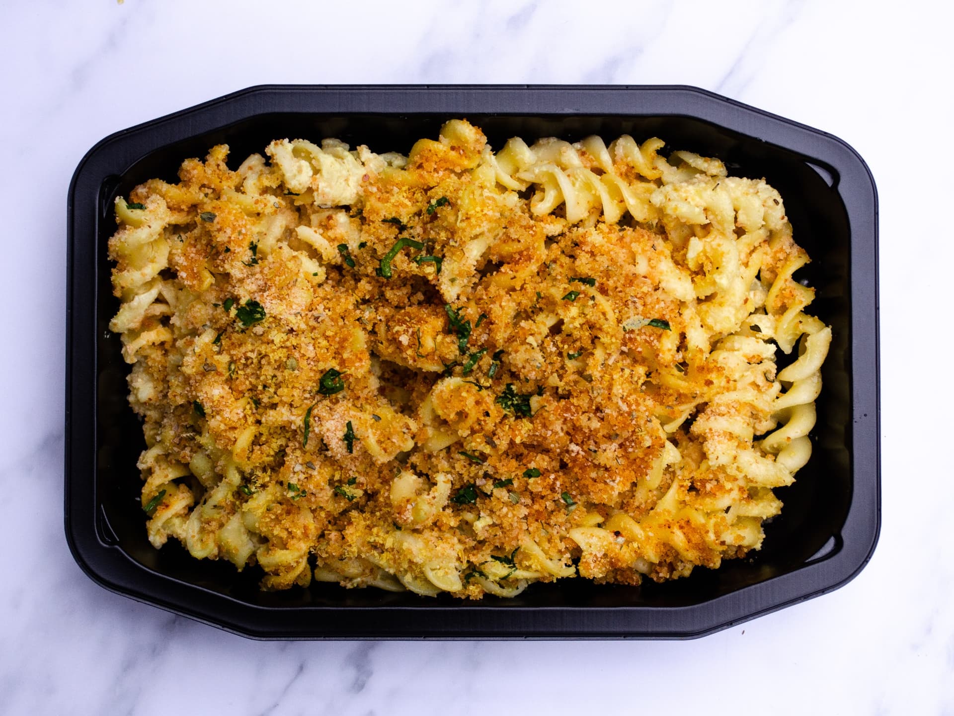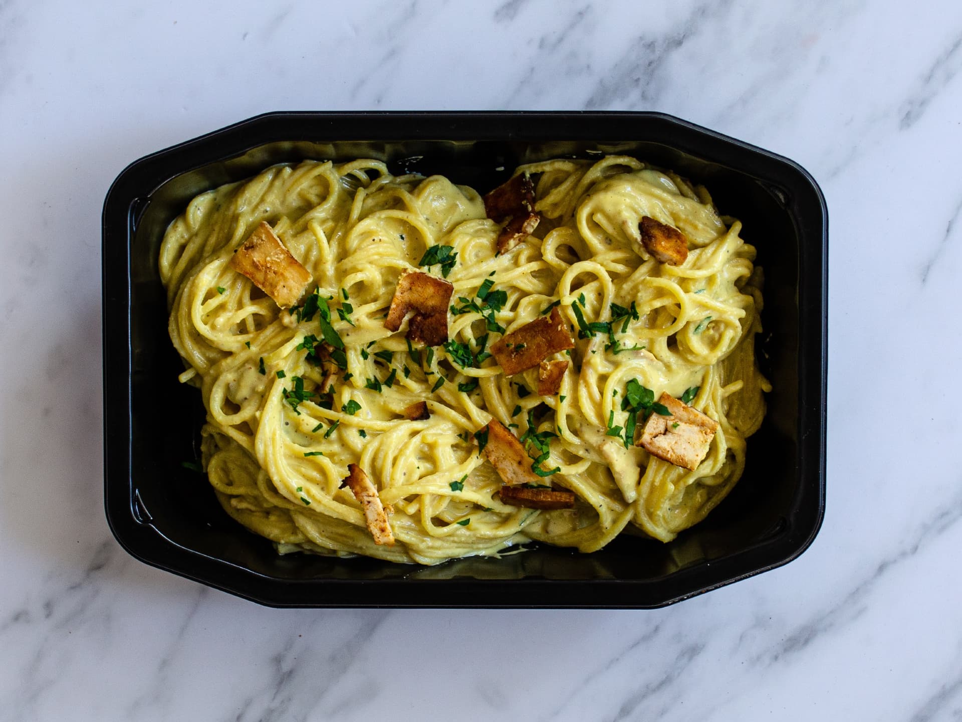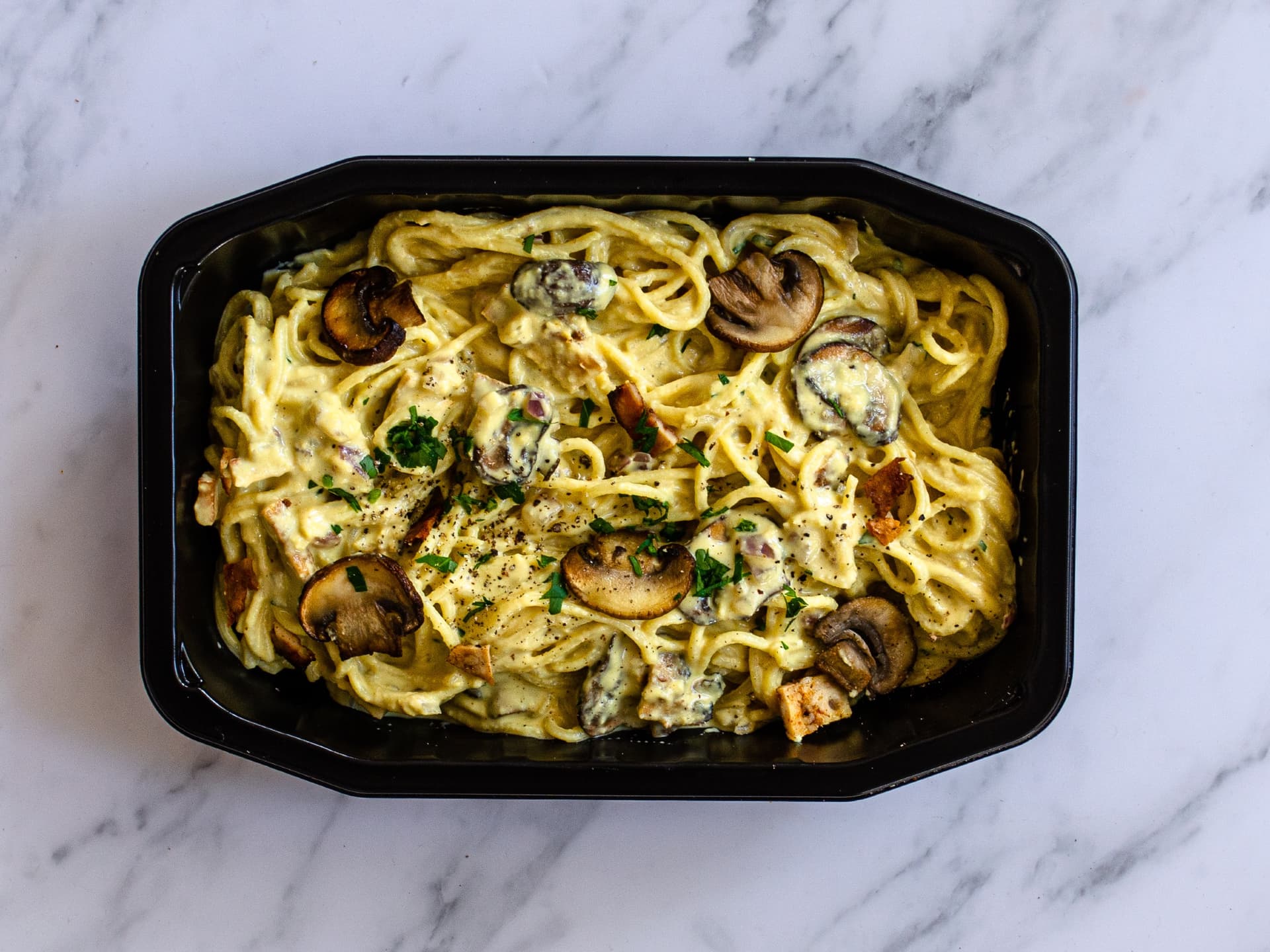 Comes frozen. Microwave from frozen. The taste of delicious traditional carbonara; spaghetti tossed with a silky sauce of cashews, garlic, mushroom and crispy tofu bacon, scattered with fresh parsley and black pepper.