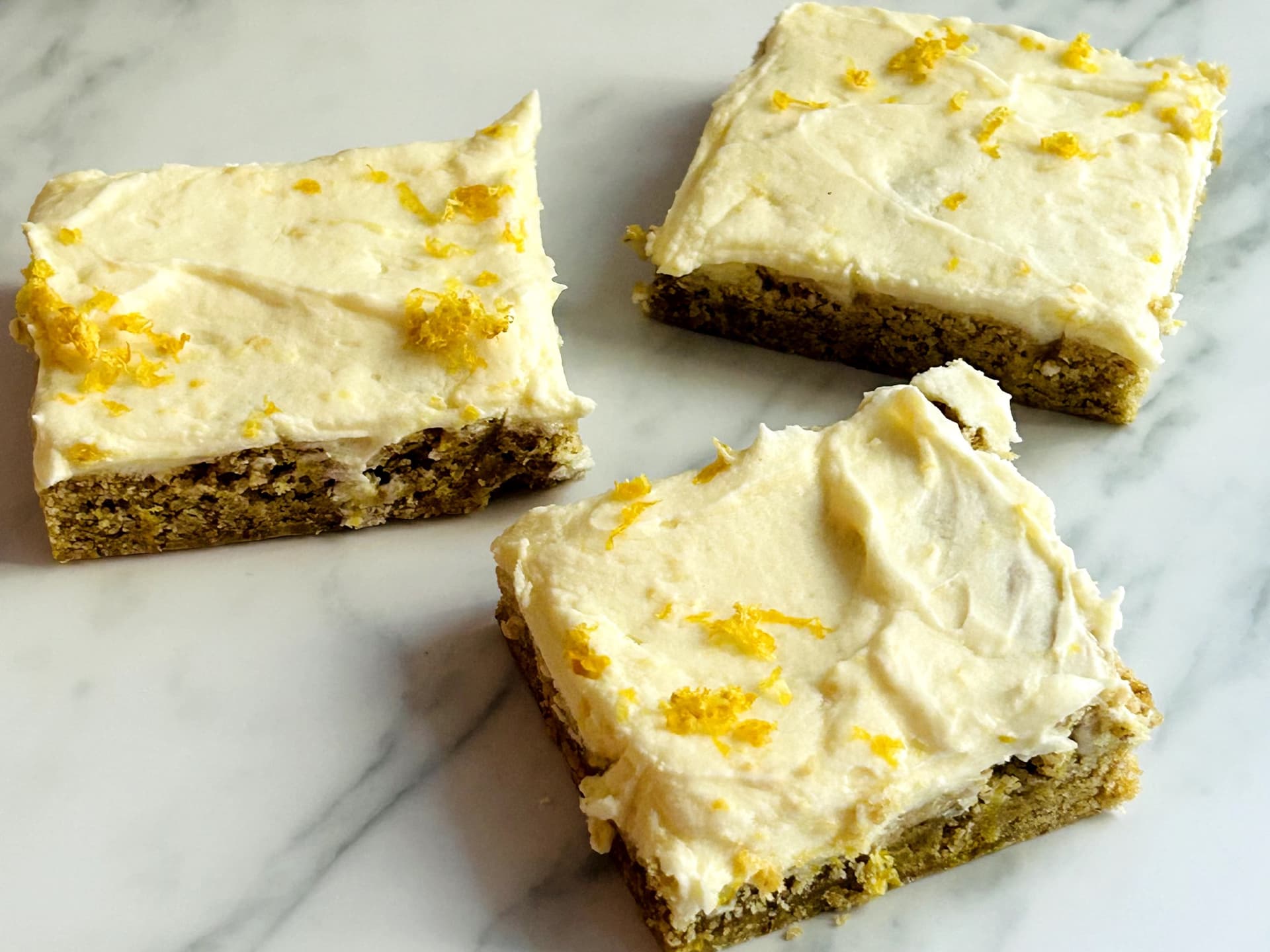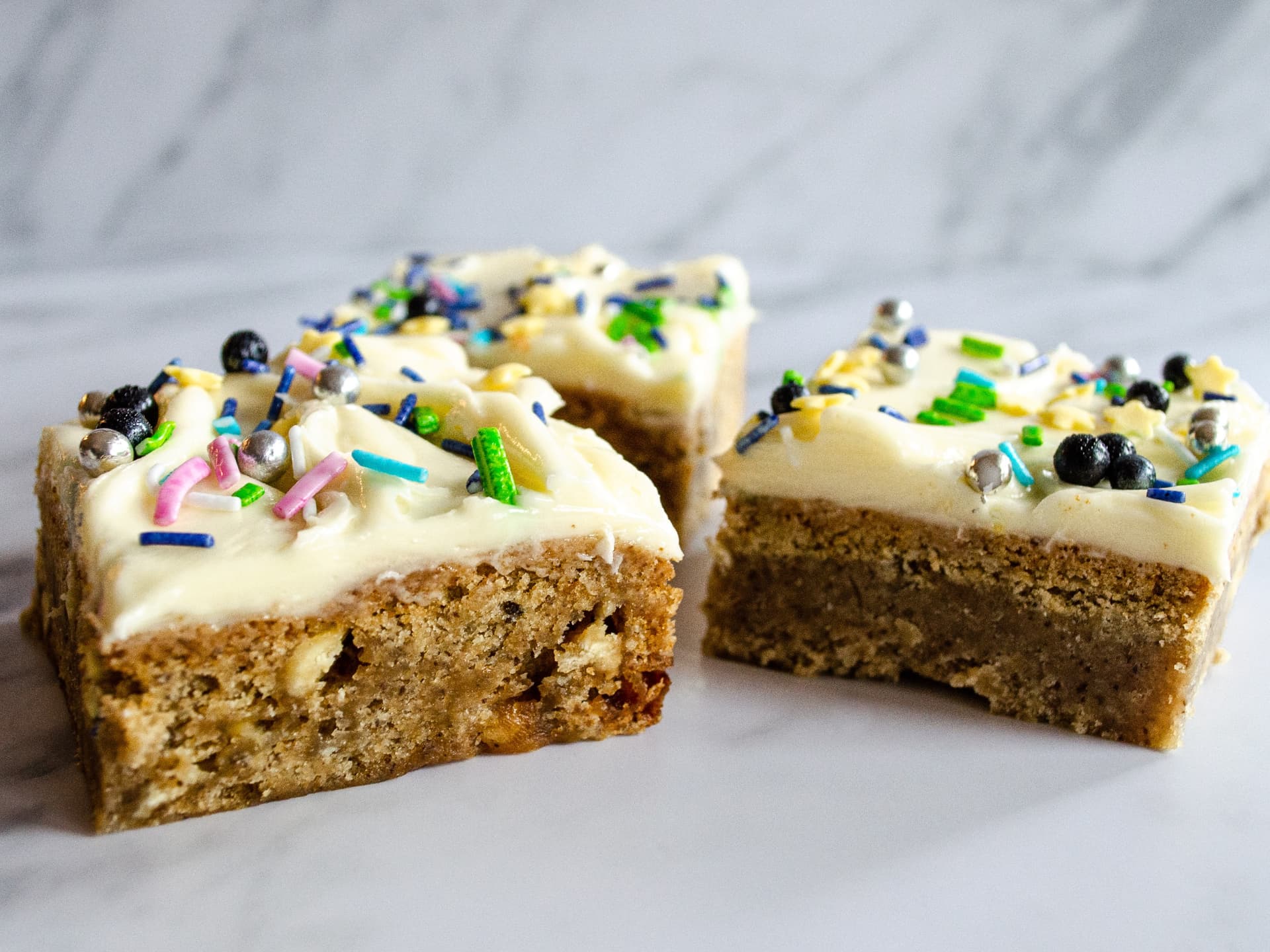 NEW LARGER BLONDIES! A decadent caramel fudgey blondie studded with vegan white chocolate and covered with a vanilla buttercream frosting. Comes frozen for a quick microwavable treat!