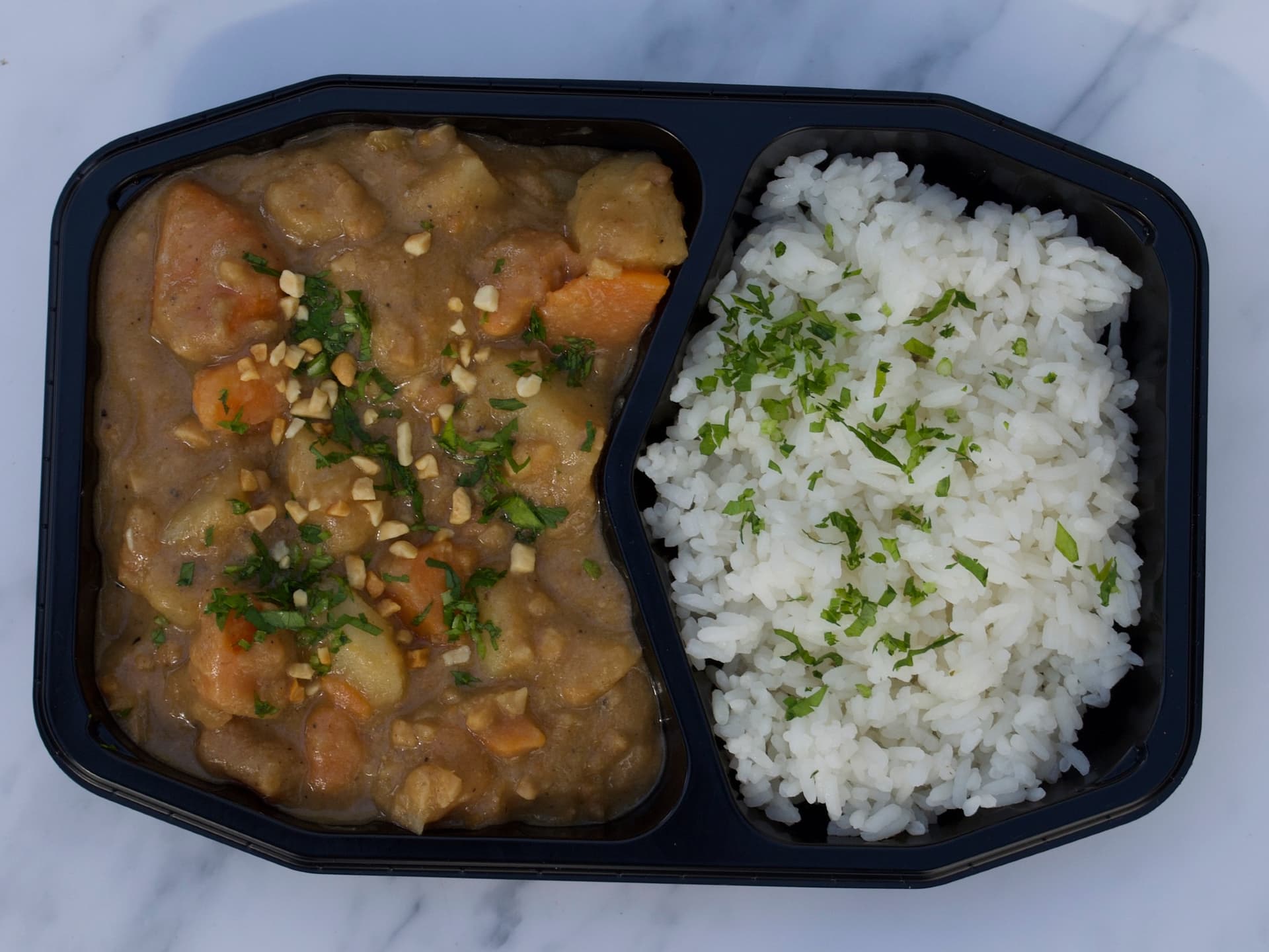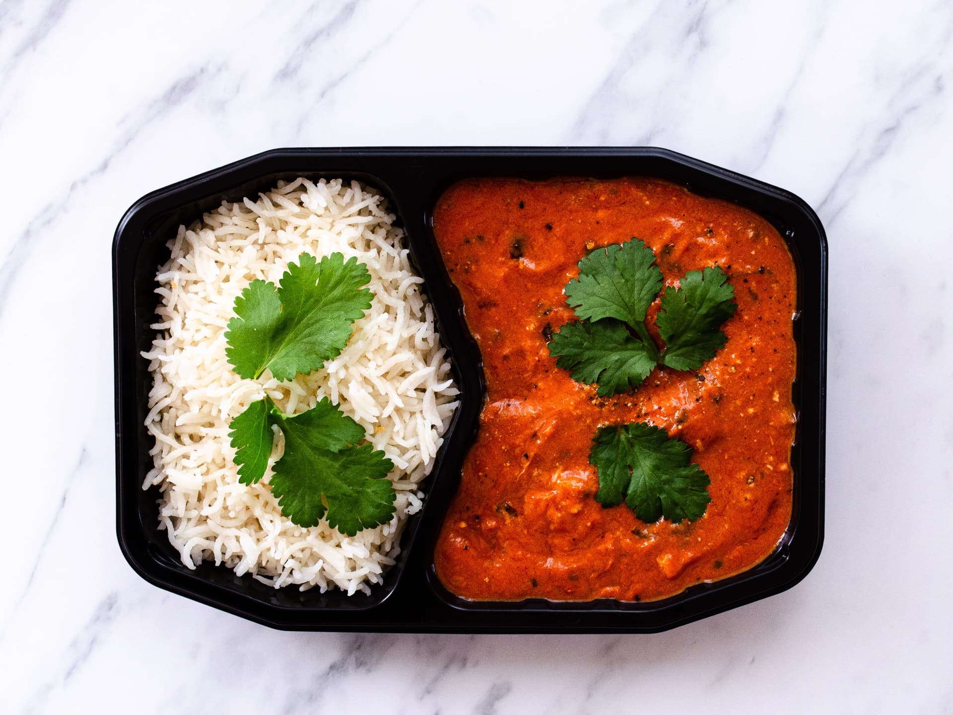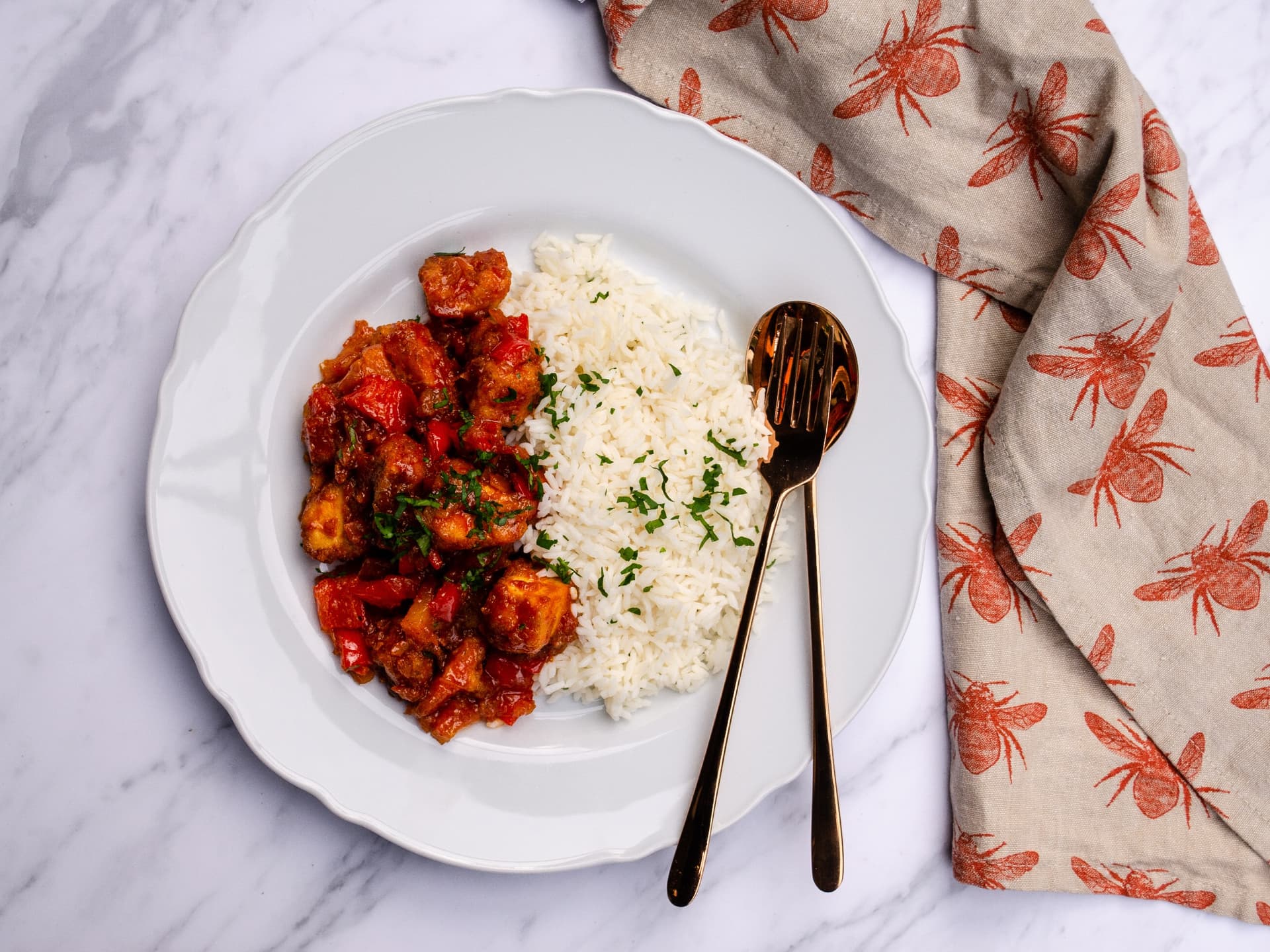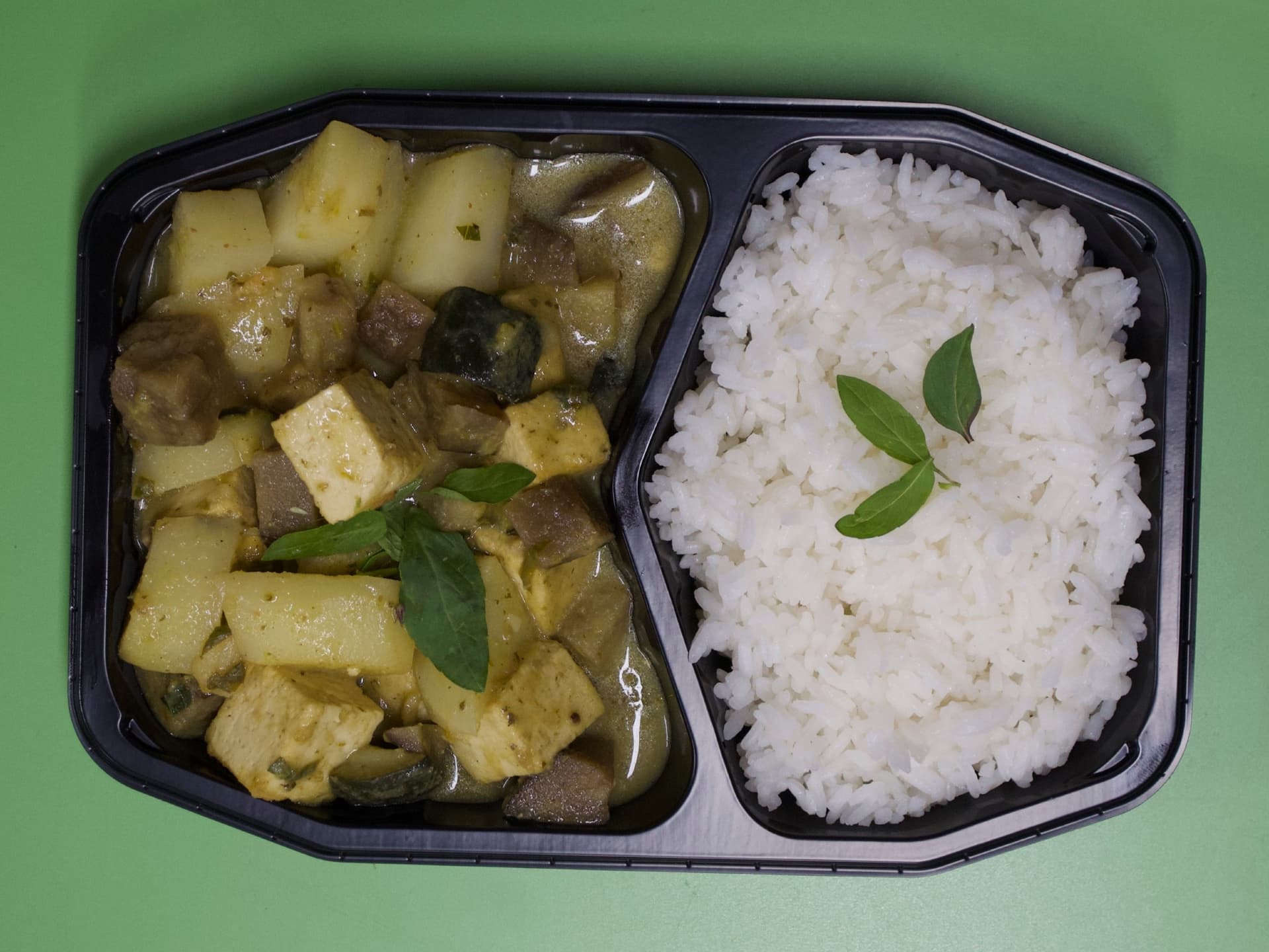 Comes frozen. Microwave from frozen. Crispy baked tofu bathed in an aromatic creamy tomato coconut sauce, served with rice.