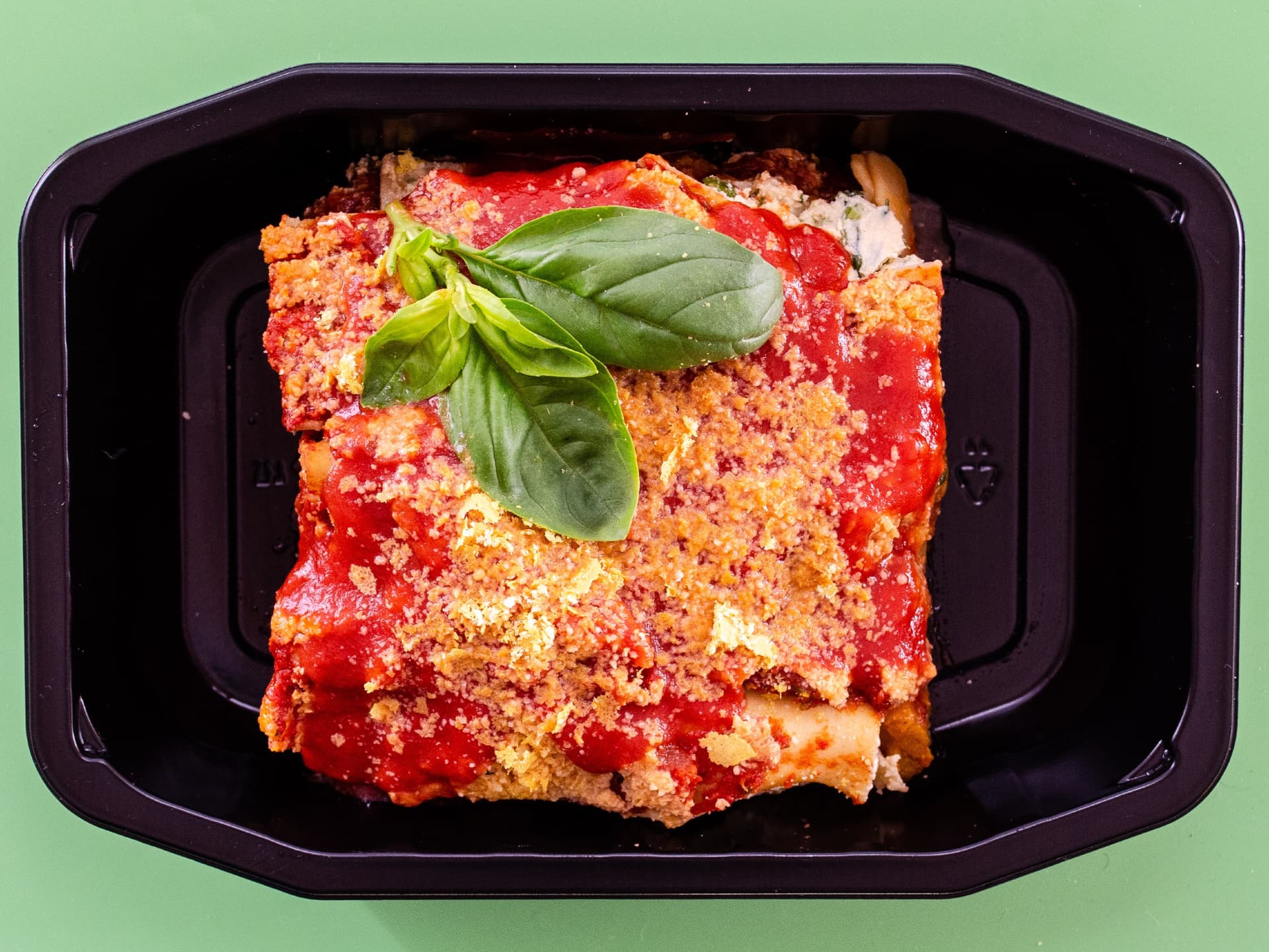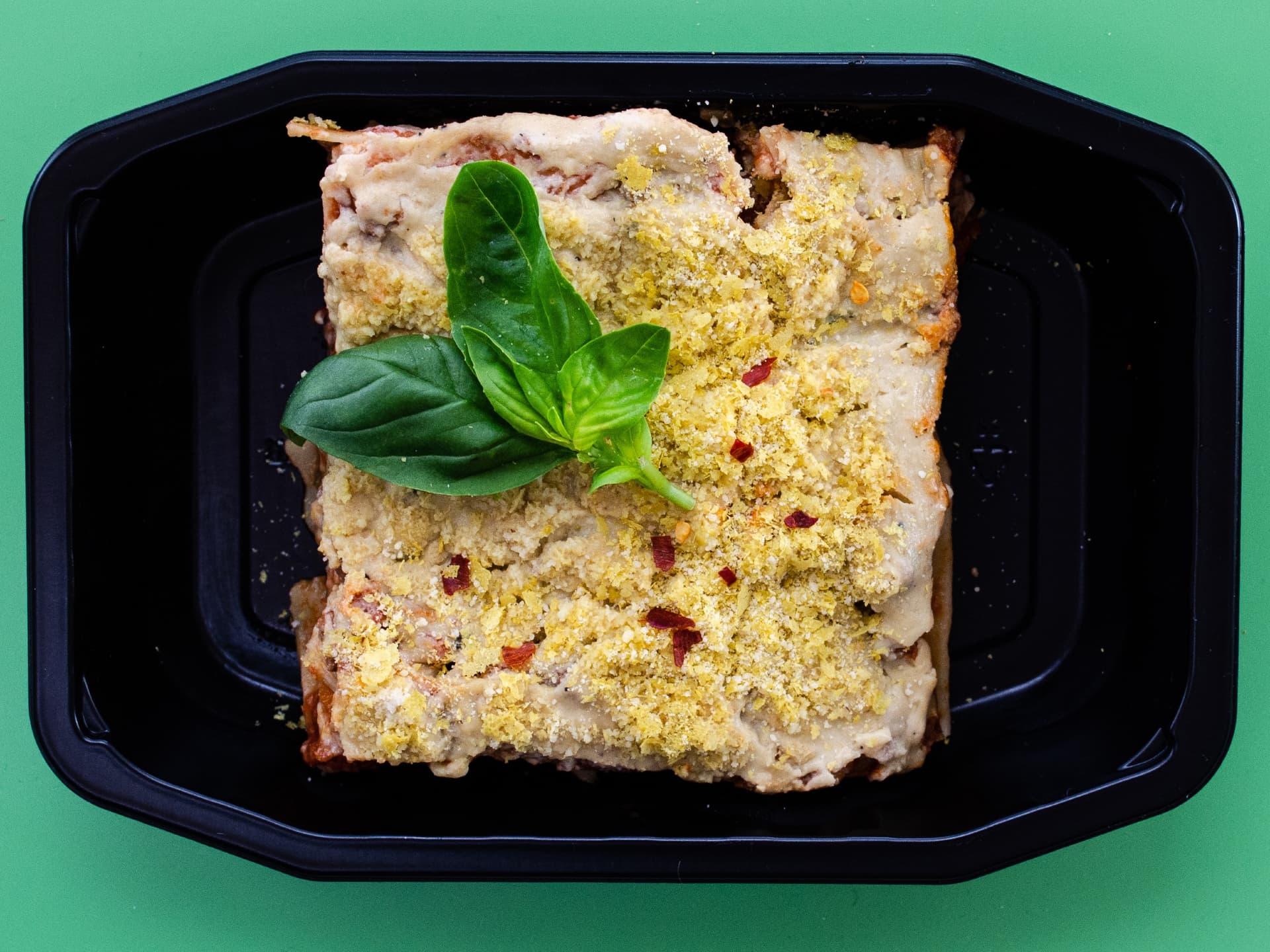Comes frozen. Microwave from frozen. Flavourful roasted vegetable and tofu ricotta lasagne.
