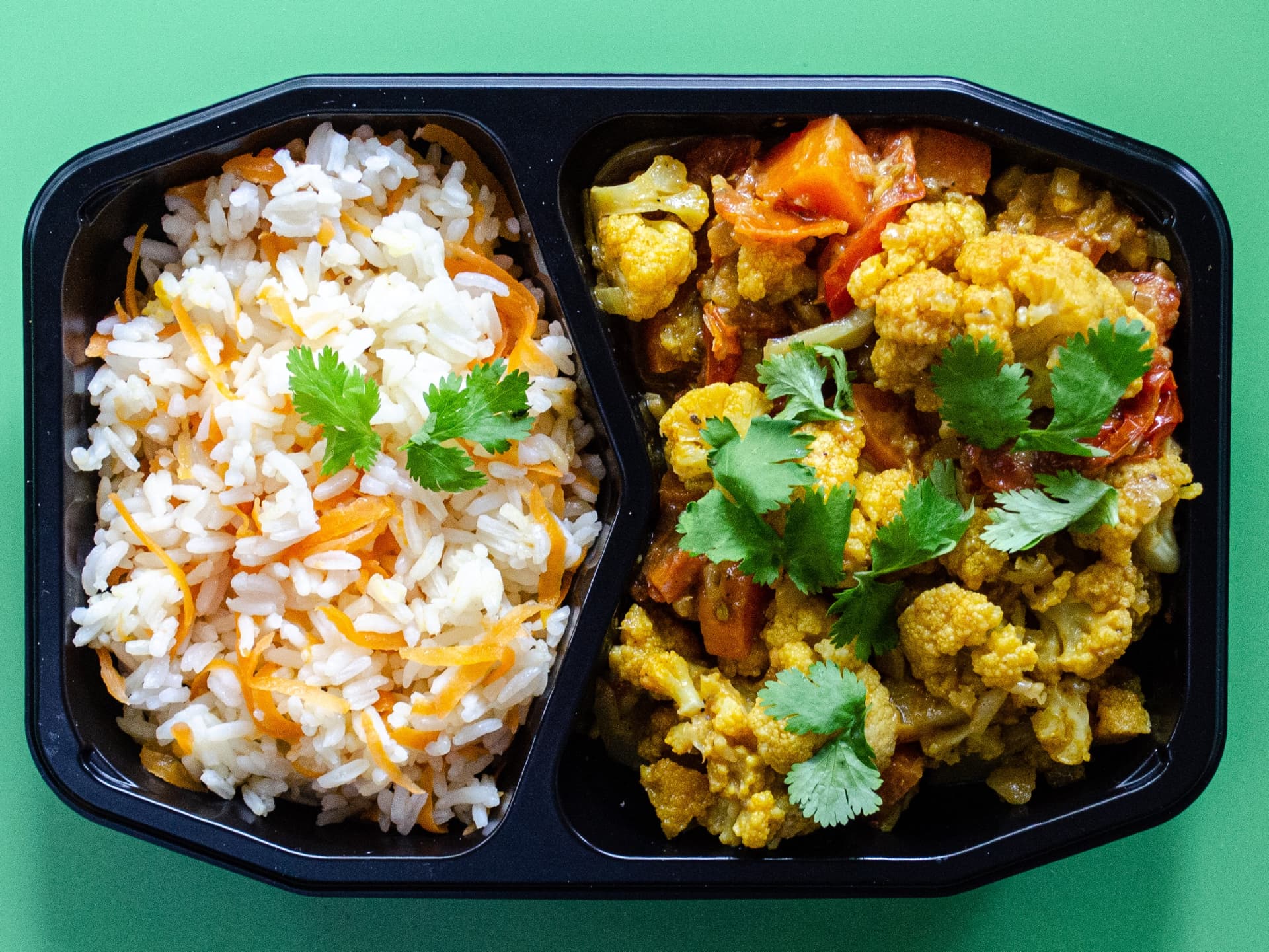 Comes frozen. Microwave from frozen. Cauliflower, tomato and carrot cooked in a circus of flavours, coconut and coriander.