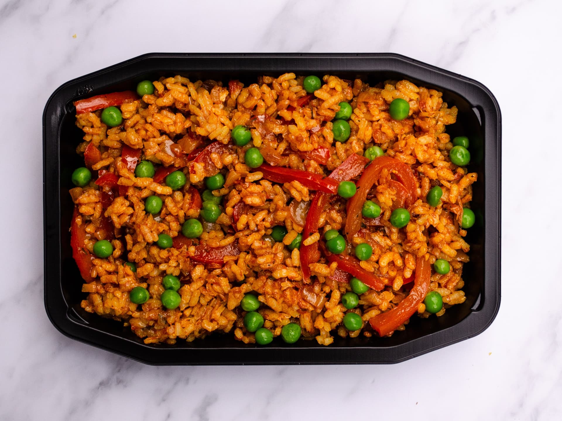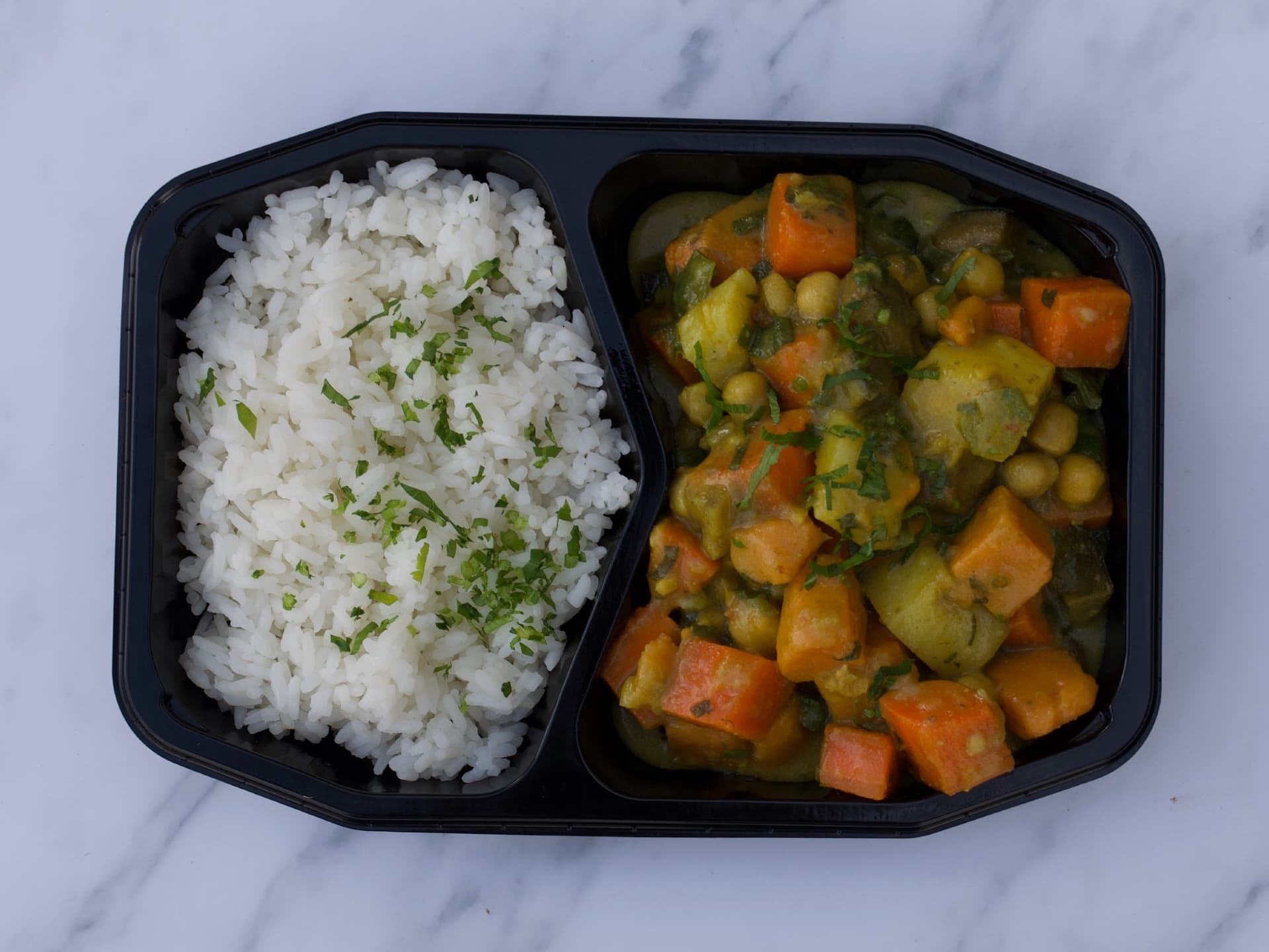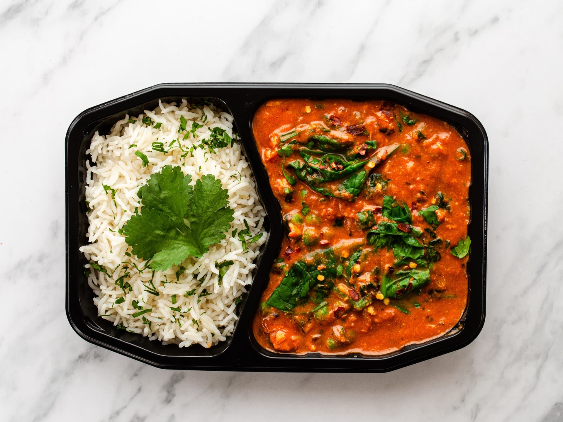Comes frozen. Microwave from frozen. Chickpeas, green peas and spinach mixed in a sea of tomato coconut and spices, served with a side of rice.