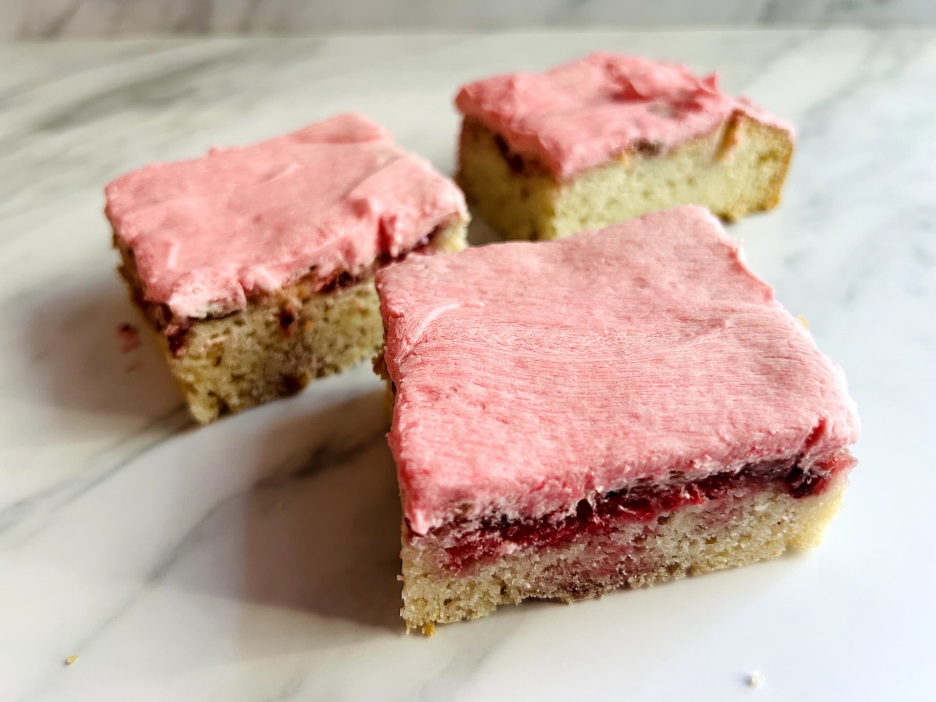 A decadent strawberry blondie with vegan white chocolate and a vanilla buttercream frosting. Comes frozen for a quick microwavable treat!