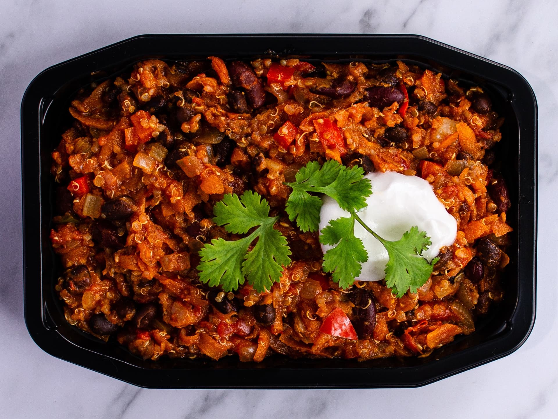 Comes frozen. Microwave from frozen. A hearty dish of cheesy scrambled tofu mixed with greens and toasted pine nuts, combined with a heavenly spiced tomato and butter bean mix.