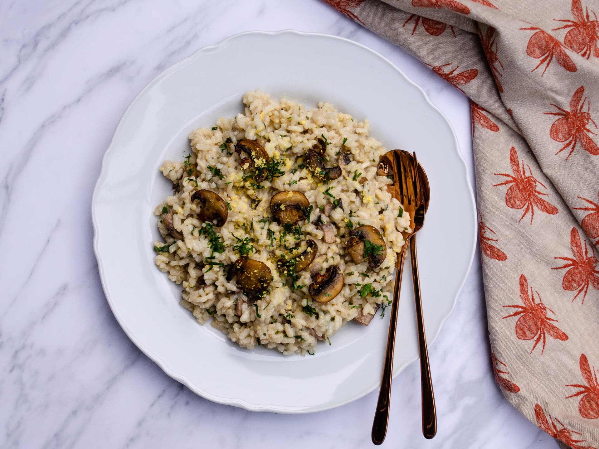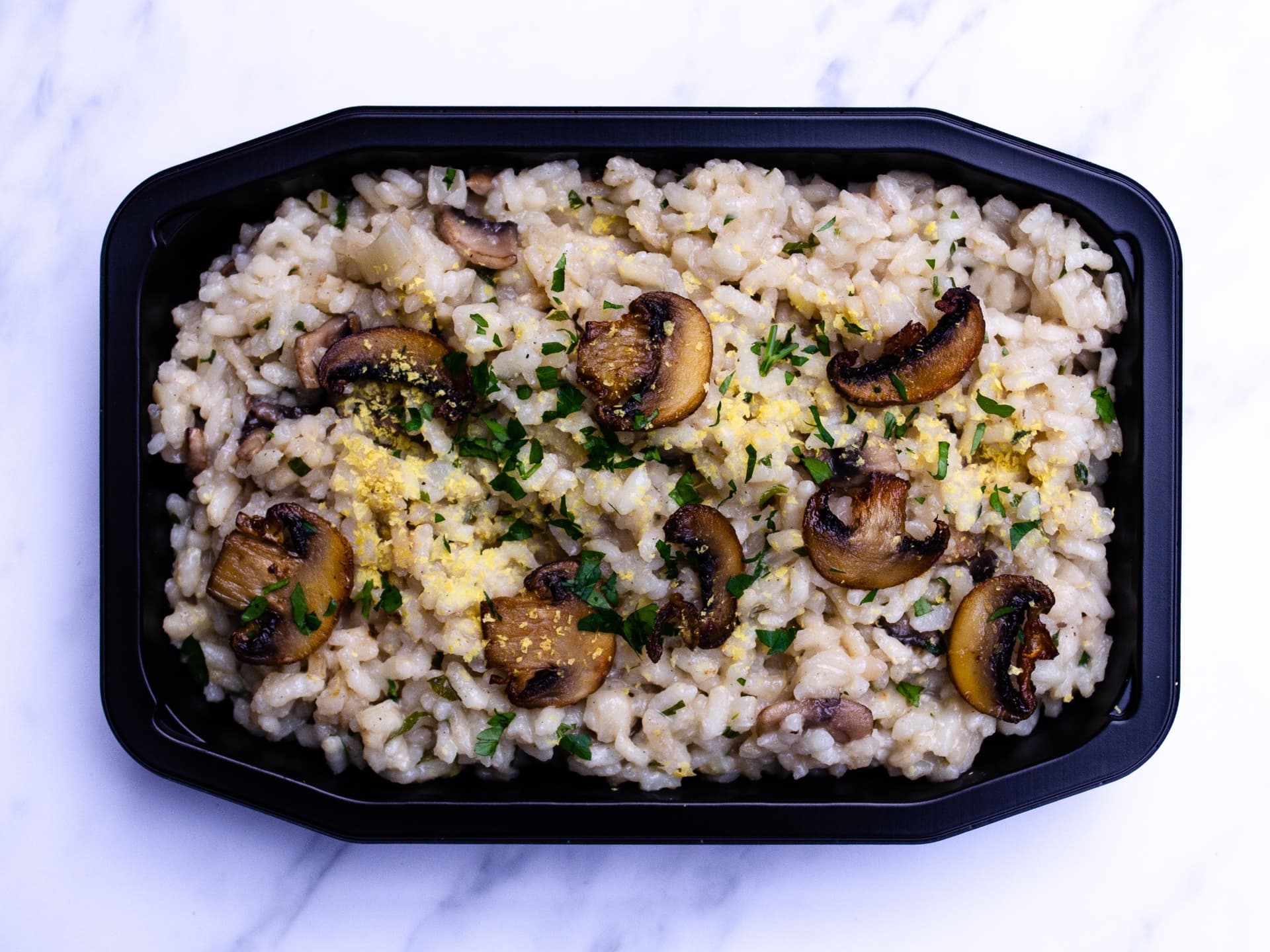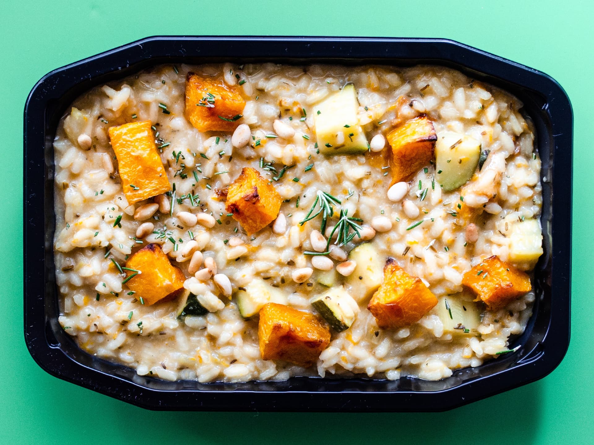 Comes frozen. Microwave from frozen. Roasted caramelised pumpkin melts into a creamy bed of aborio rice, white wine and zucchini, with a sweet crunch of pine nuts.