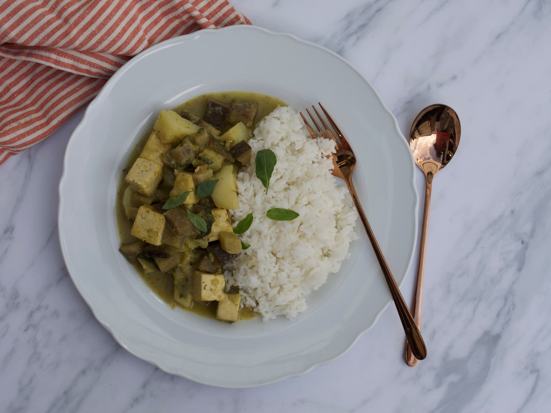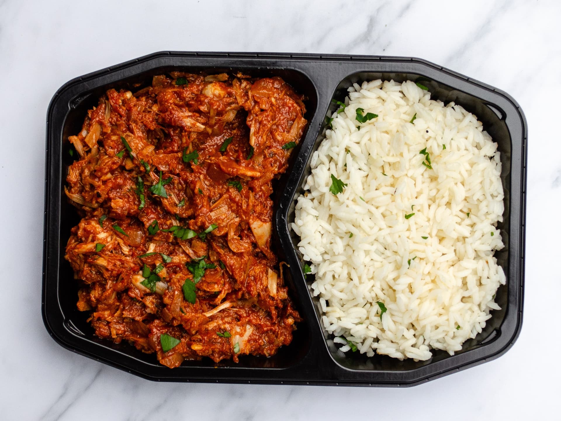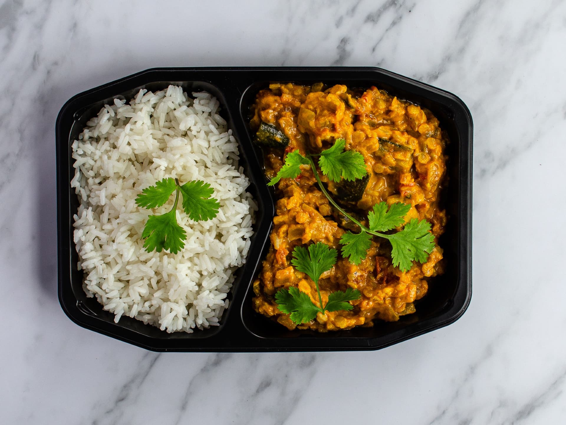 Comes frozen. Microwave from frozen. A creamy and satisfying eggplant and red lentil dahl with a delicious medley of spices, served with fluffy jasmine rice.