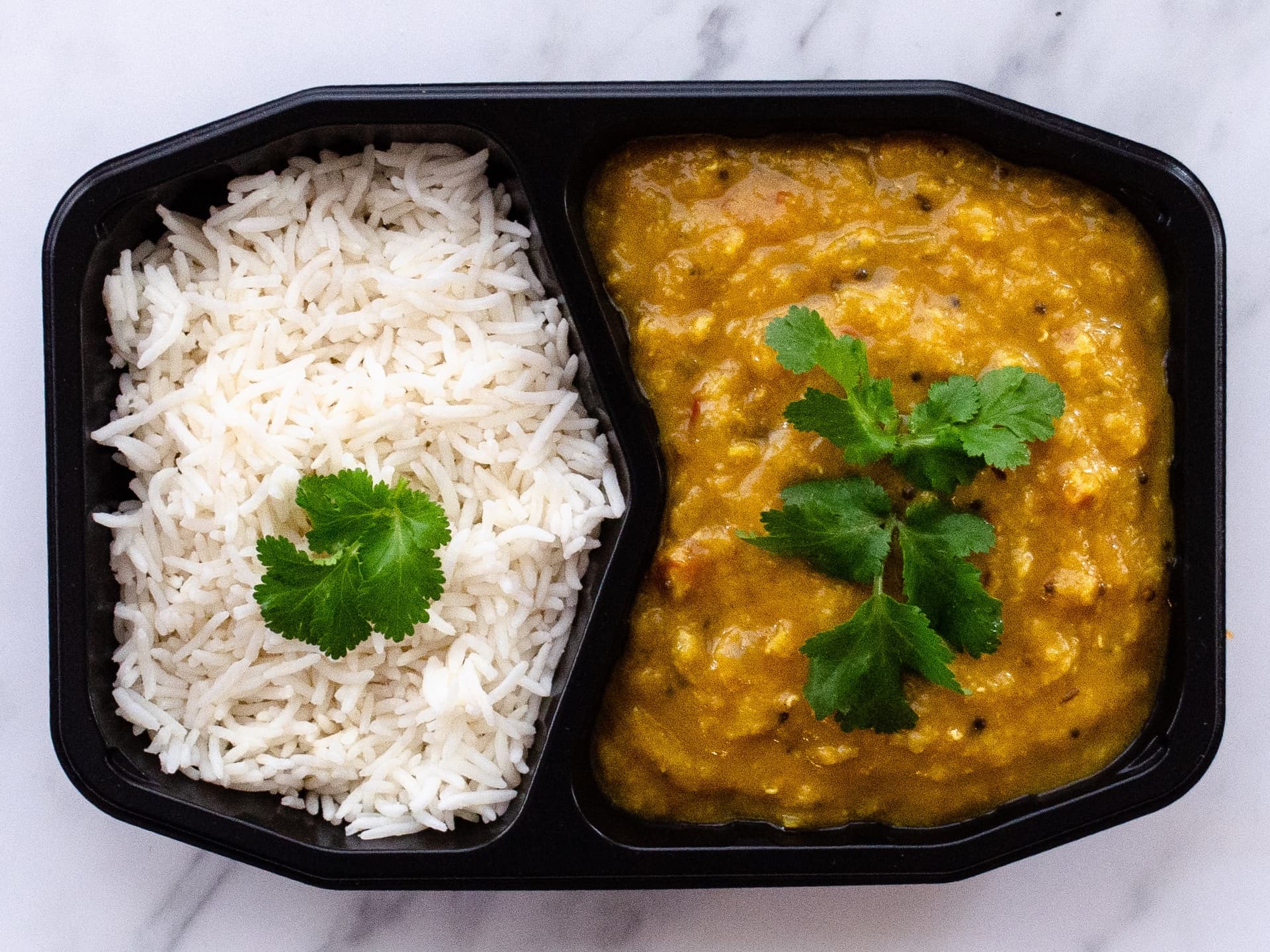 Comes frozen. Microwave from frozen. A creamy and satisfying red lentil dahl with a delicious medley of spices and ginger, served with fluffy jasmine rice.