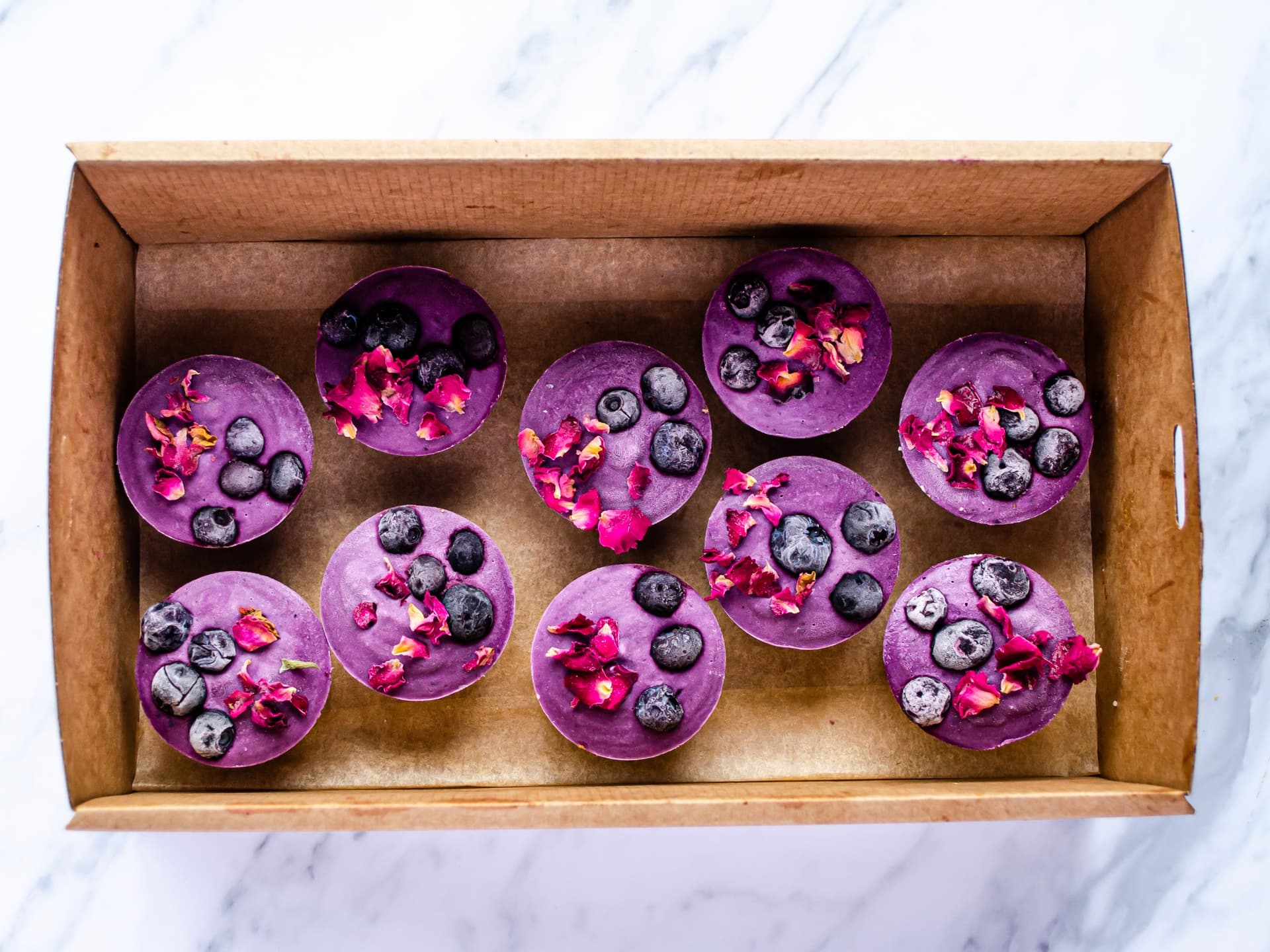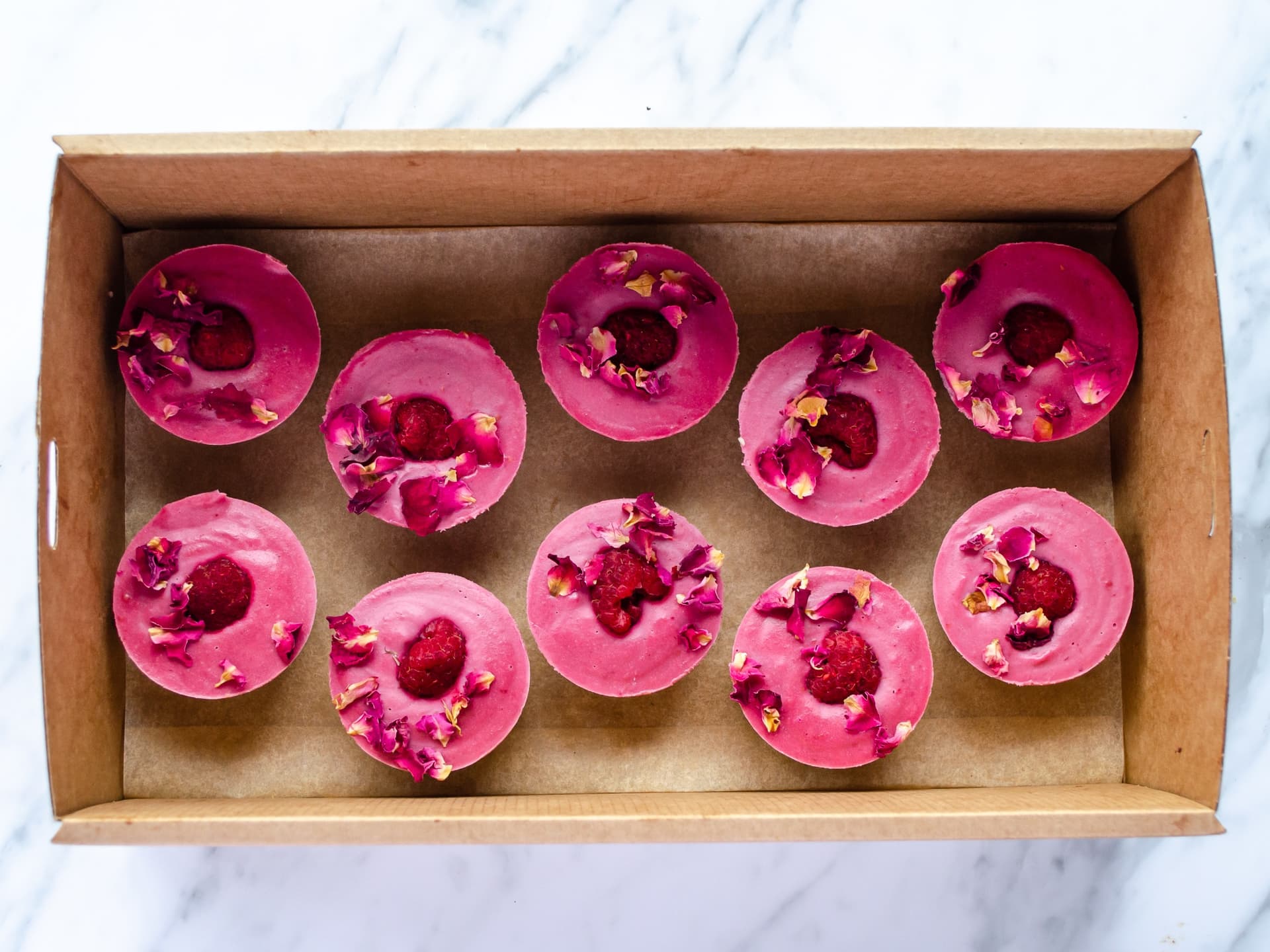Large slices of our decadent strawberry blondie with vegan white chocolate and a vanilla buttercream frosting.