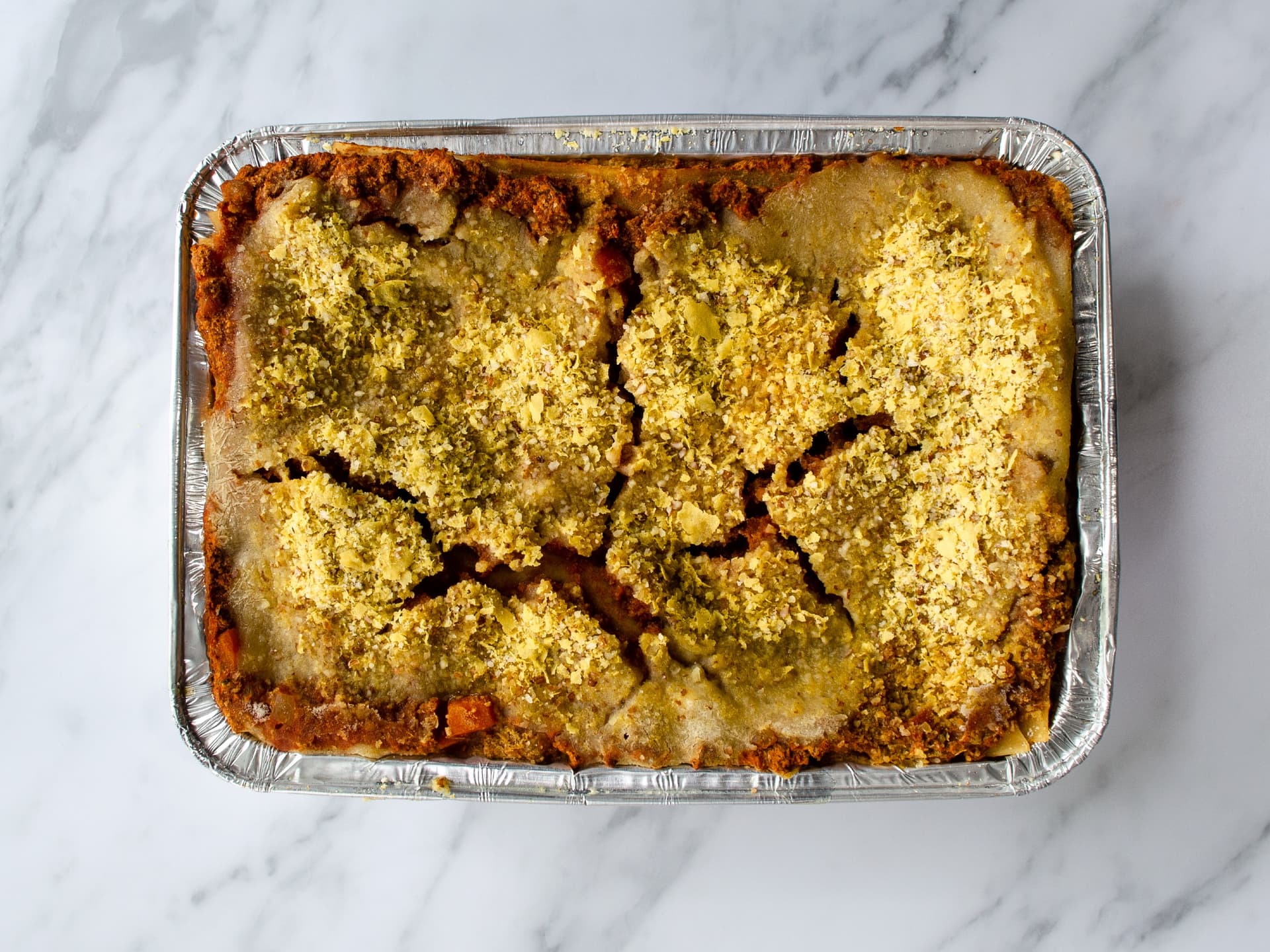 A vegan take on your favourite classic cheesy lasagne with a vegan mince and tomato sauce, cooked with creamy cheesy bechamel and gluten free lasagne sheets. Comes in an oven safe tray for you to cook at home! Serves 2.