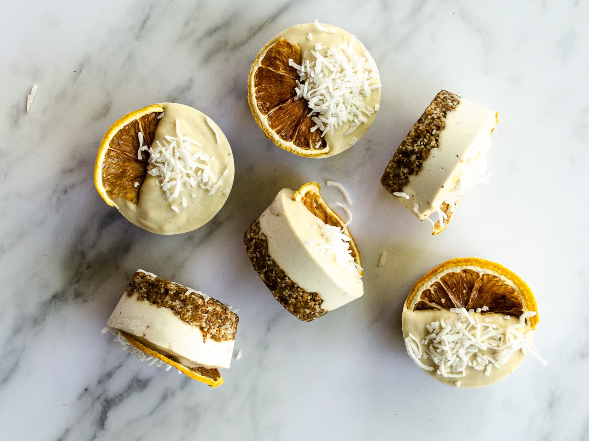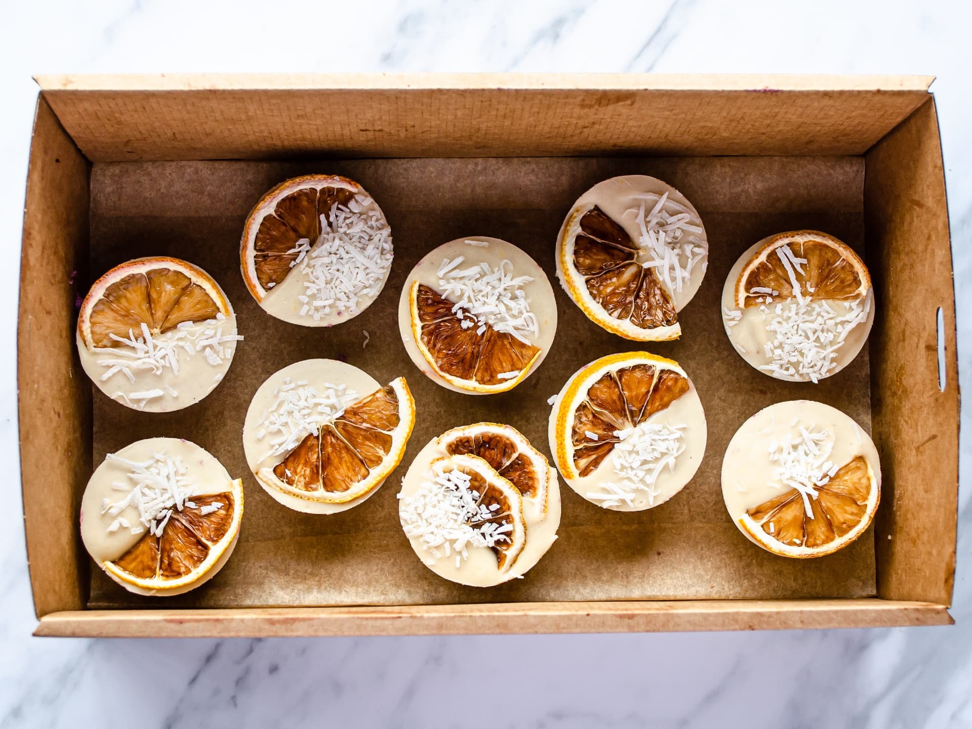 Large slices of our decadent caramel fudgy blondie studded with vegan white chocolate and covered with a vanilla buttercream frosting.