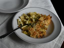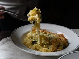 Macaroni pasta (Wheat), Thickened cream (Milk), Leek, Milk fat, Mozzarella (Milk), Parmesan (Milk), Scarmorza (Milk), Panko (Wheat), Unsalted butter (Milk), Dijon mustard, Salt, Black pepper, Sea salt