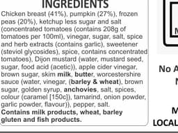 Chicken breast, Frozen peas, Ketchup with less sugar and salt, Skim milk, Dijon mustard, Vinegar, Pumpkin, Sugar, Salt, Spices, Herb extracts, Sweetener, Apple cider vinegar, Brown sugar, Butter (Milk), Worcestershire sauce (Wheat, Fish), Onion powder, Garlic powder, Pepper