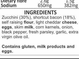 Whole eggs, Light cheddar cheese (Milk), Zucchini, Shortcut bacon, Skim milk, Corn kernels, Self raising flour (GF), Onion, Black pepper, Parsley, Garlic, Extra virgin olive oil