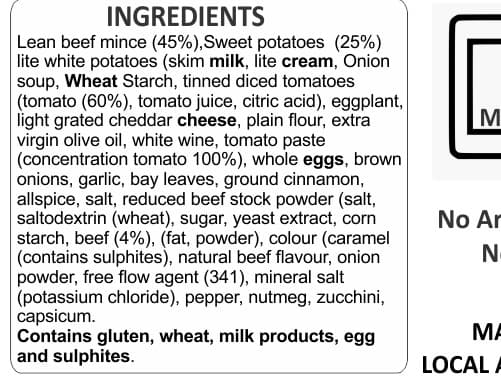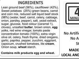 Lean ground beef, Cauliflower, Sweet potato, Green beans, Carrots, Low sodium beef stock (Wheat), Tomato paste, Crushed tomatoes, Egg yolks, Cream (Milk), Butter (Milk), Brown onion, Red wine vinegar, Extra virgin olive oil, Celery, Thyme, Oregano leaves, Garlic, Paprika, French onion soup mix