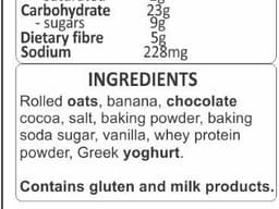 Banana, Rolled oats, Greek yoghurt (Milk), Protein powder (whey) (Milk), Dark chocolate (Milk), Sugar, Cocoa powder, Salt, Baking powder, Vanilla essence