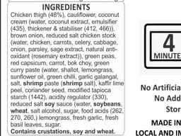 Chicken thighs, Frozen peas, Cauliflower, Coconut cream, Reduced sodium chicken stock (Wheat), Carrots, Red capsicum, Bok choy, Green curry paste (Crustacean, Fish, Peanut), Brown onion