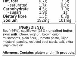 lean Beef, Cauliflower, Light milk, Mushrooms, Tomato paste, Low sodium beef stock (Wheat), Greek yoghurt (Milk), Brown onion, Plain flour (Wheat), Salt, Pepper, Extra virgin olive oil