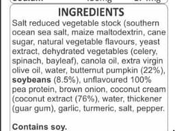 Pumpkin, Reduced salt vegetable stock (Wheat), Coconut cream, Celery, Salt, Sugar, Yeast extract, Spinach, Bay leaves, Extra virgin olive oil, Pea protein, Brown onion, Garlic, Turmeric, Sea salt, Pepper