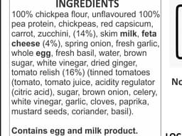 Whole eggs, Pea protein, Feta (Milk), Tomato relish, chickpea flour, Chickpeas, Red capsicum, Skim milk, Spring onion, Garlic, Fresh basil, White vinegar, Brown sugar, Fresh ginger