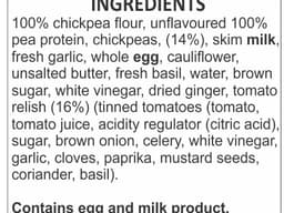 Cauliflower, silverside, Skim milk, Pea protein, Canned diced tomatoes, Whole eggs, Sugar, Frozen corn kernels, Butter (Milk), Fresh basil, chickpea flour