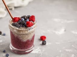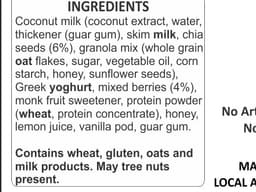 Greek yoghurt (Milk), Protein powder (whey) (Milk), Coconut milk, Chia seeds, Mixed berries, Skim milk, Honey