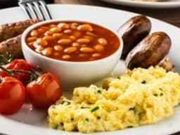 Scrambled Eggs, Sausages, Cherry Tomatoes, Spinach, Beans, And Salsa
