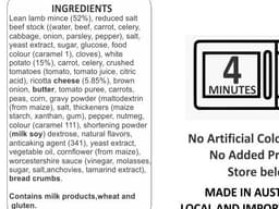 Lean beef mince, Low fat ricotta cheese (Milk), Carrots, Frozen peas, Frozen corn kernels, Tomato puree, Gravox (Milk, Soy), Brown sugar, Salt, Pepper, Extra virgin olive oil, Low sodium beef stock (Wheat), Worcestershire sauce (Wheat, Fish), White potato