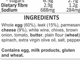 Whole eggs, Leek, Crushed tomatoes, Parmesan cheese (Milk), White wine, Chives, Brown onion, Butter (Milk), Plain flour (Wheat), Spinach, Extra virgin olive oil, Salt, Pepper